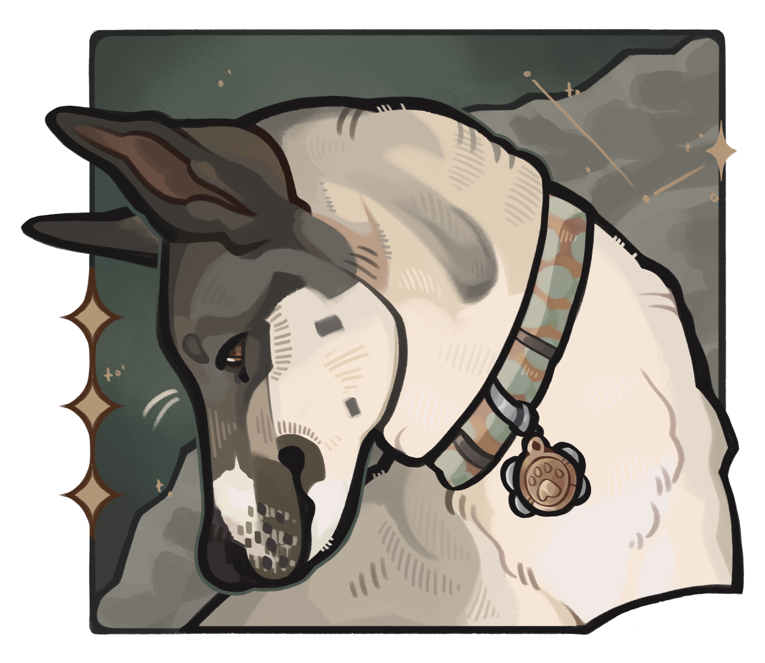 A shoulders-up illustration of a pet or loved one. Props, florals, and other additions are included in the price!Larger pieces may be available upon request.Must have ample photographic reference, especially of complicated markings, specific clothing/objects, or other sentimental items!