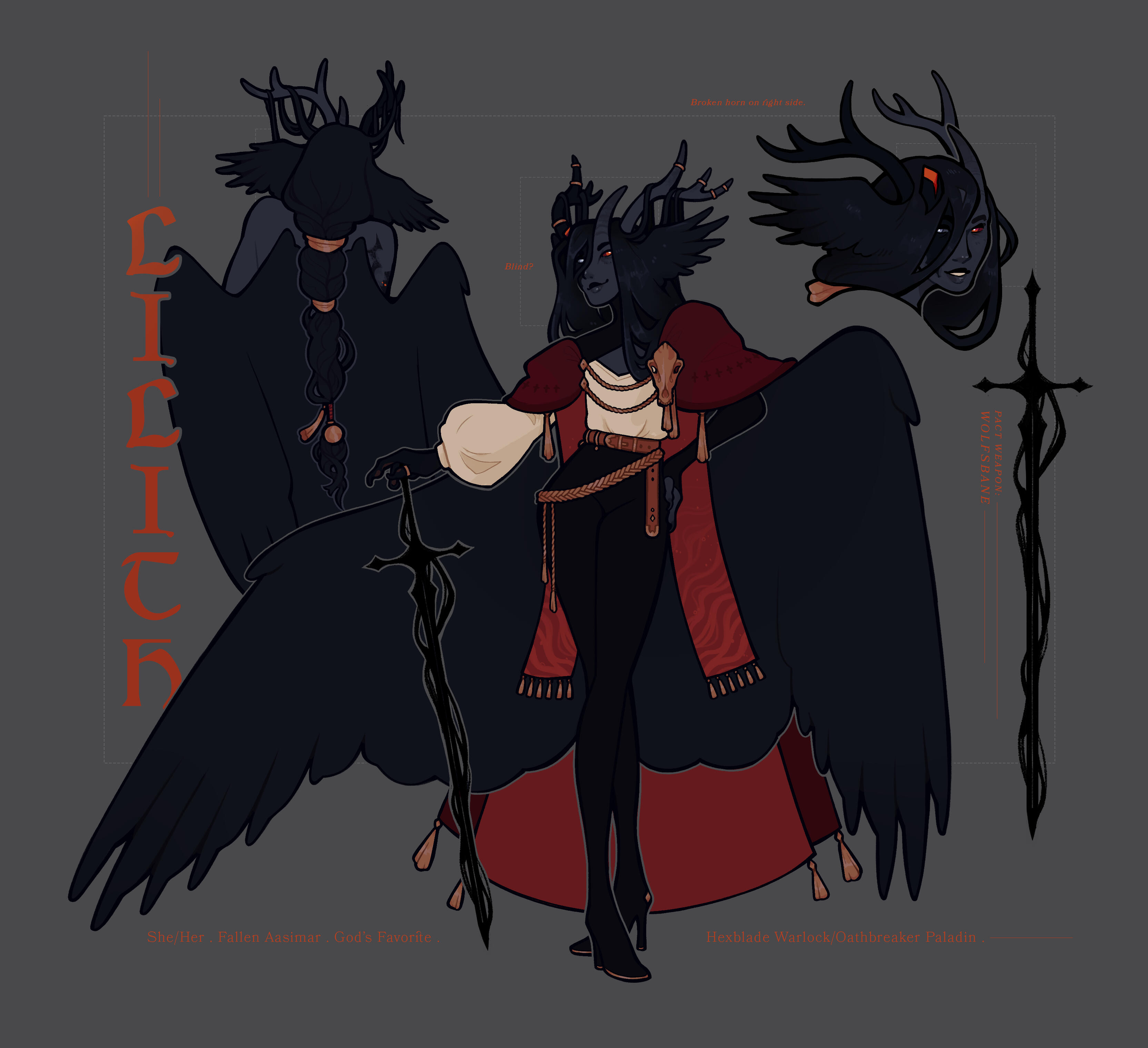 A reference sheet of an existing character design. For customs, please see above.A plain reference sheet includes one fullbody and a few detail shots depending on complexity.Reversed reference sheets may either be mirrored with an alternate outfit/form, or reversed to show the back.Complex reference sheets may include multiple unique poses or expressions, and are quote based.